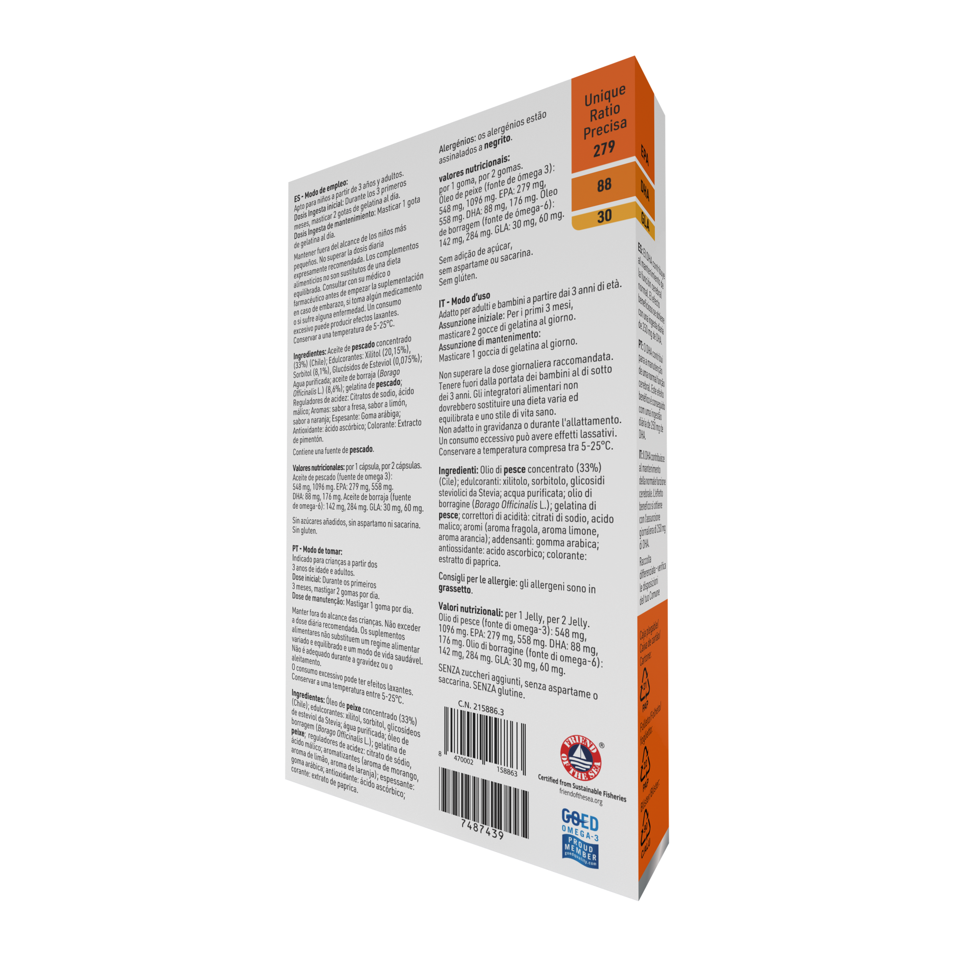 Óleo de peixe concentrado (33%) (Chile); edulcorantes: xilitol, sorbitol, glicosídeos de esteviol da Stevia; água purificada; óleo de borragem (Borago Officinalis L.); gelatina de peixe; regulador de acidez: citrato de sódio, ácido málico; aromatizantes (aroma de morango, aroma de limão, aroma de laranja); espessantes: goma arábica; antioxidante: ácido ascórbico; corante: extrato de paprica.